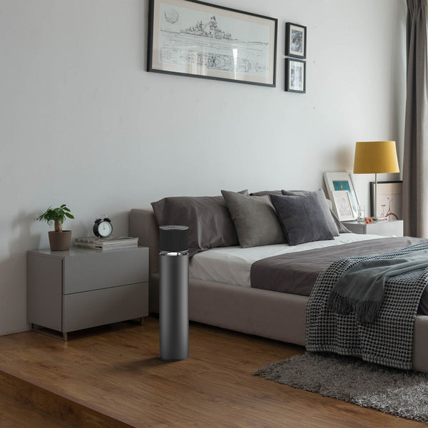 The E600 is designed to be placed on the floor, standing at just around two feet tall. Featuring a sleek stainless steel body with a tubular shape. Choose from silver or grey to perfectly complement your home and style.